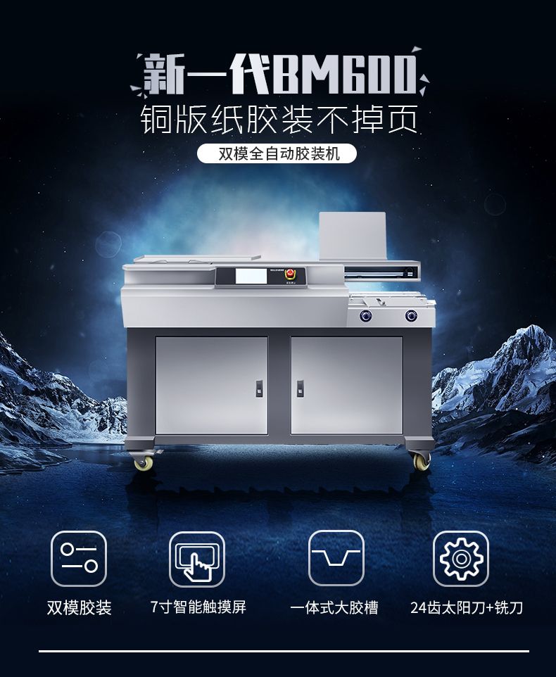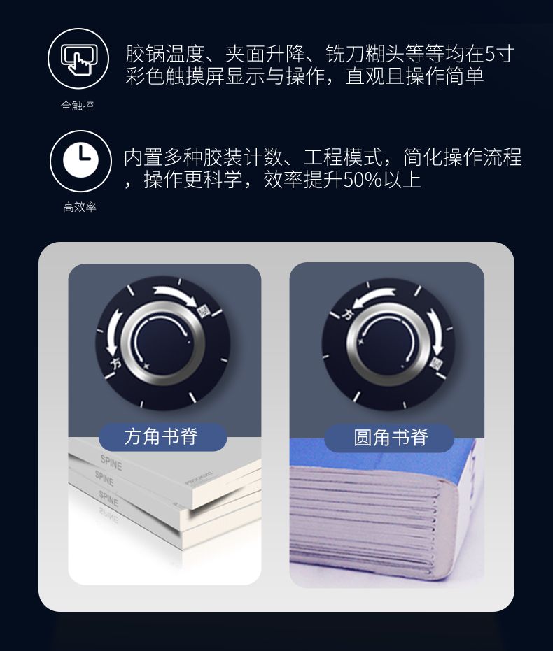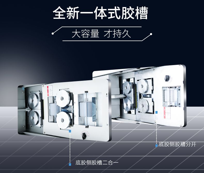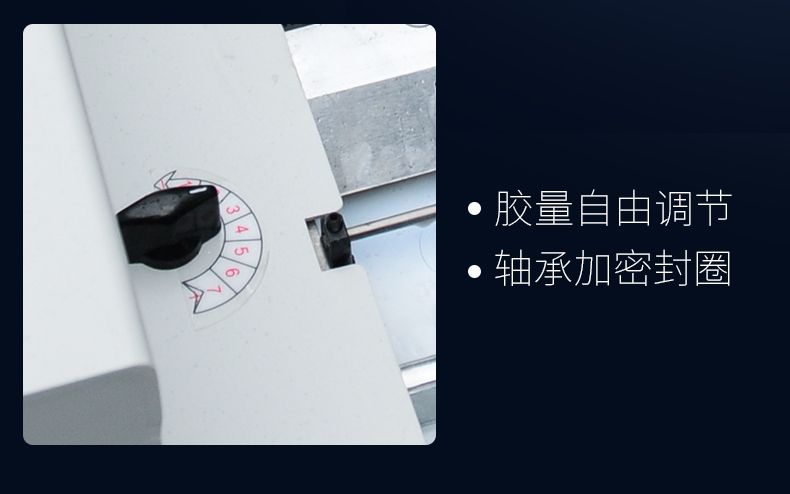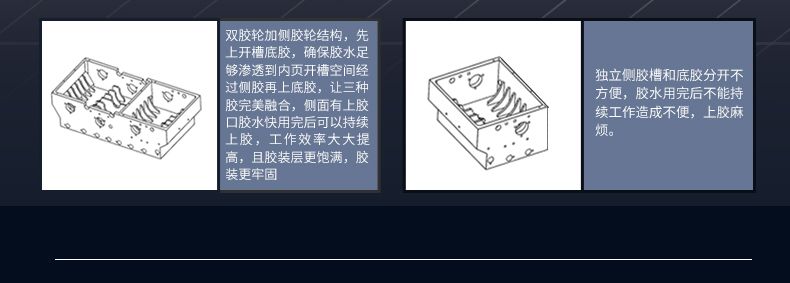 3.加大型膠槽雙膠輪設計帶側膠。按照BQ270膠槽設計,第一膠輪做為銑刀刀槽上膠,保證膠水的滲透性比較強。第二膠輪書本背脊上膠,上膠效果比較好。